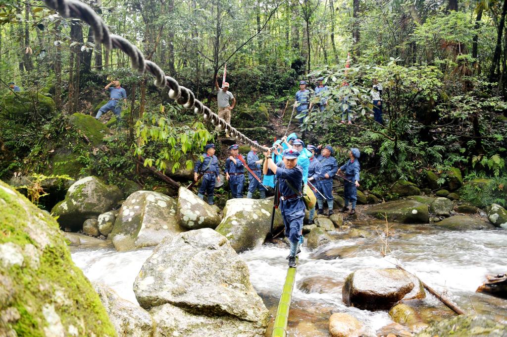 學員在井岡山的荊竹山體驗紅軍穿越峽谷