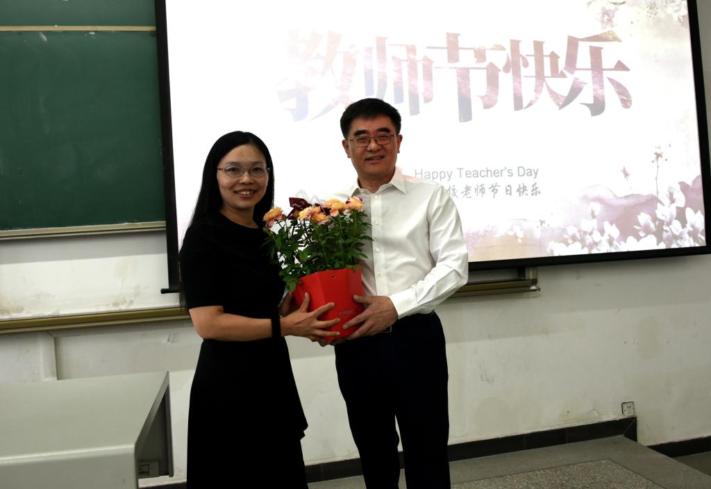 校長(zhǎng)趙金洲在教師節(jié)向教師送上鮮花