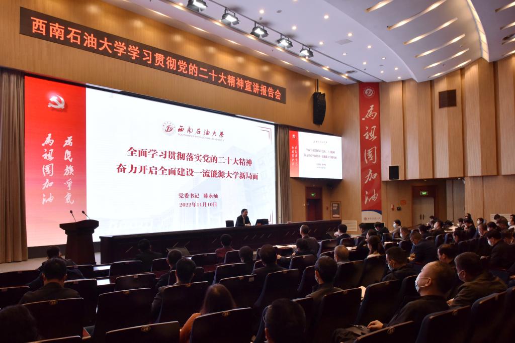 校領導班子帶頭開展黨的二十大精神解讀。2022年11月10日,校黨委書記陳永燦以《全面學習貫徹落實黨的二十大精神 奮力開啟全面建設一流能源大學新局面》為題,為全校師生宣講黨的二十大精神,陳永燦圍繞以中國式現代化全面推進中華民族偉大復興,對黨和國家事業的新部署新要求,加強黨的全面領導、堅定不移推進全面從嚴治黨的部署和要求,以頑強斗爭應對風險挑戰的要求,黨的青年工作,深刻領會黨的二十大關于教育的重要要求等方面,對黨的二十大提出的新思想新論斷、作出的新部署新要求,作了系統深刻的闡釋解讀。學校領導班子成員均運用黨課、團課、思政課等渠道對分管單位進行了黨的二十大精神宣講。