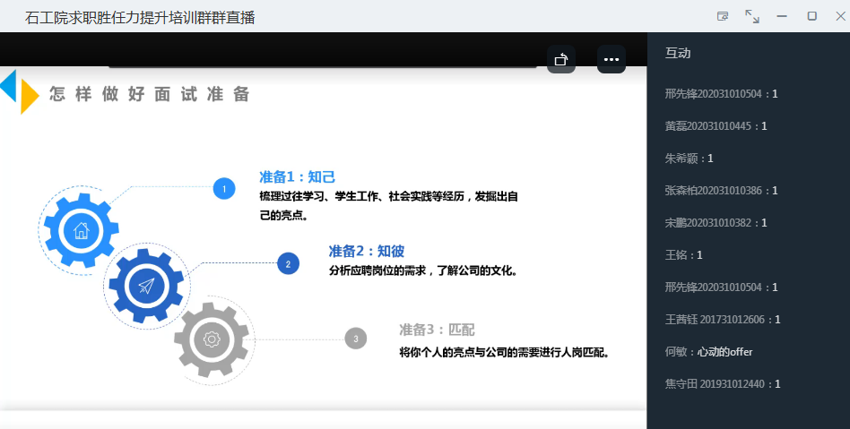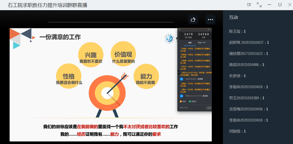 2020年11月27日-12月10日,石工院成功舉行個(gè)性化求職勝任力提升培訓(xùn),本次培訓(xùn)包括求職簡(jiǎn)歷、求職面試、求職禮儀和求職心理調(diào)適共4部分組成,旨在通過(guò)培訓(xùn)全方位提升同學(xué)求職勝任力。