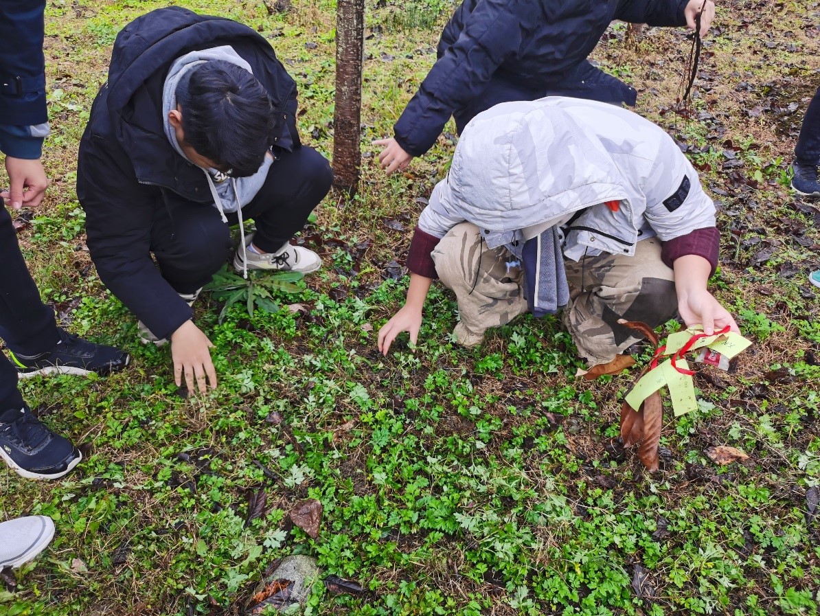學生們在撿樹枝除雜草
