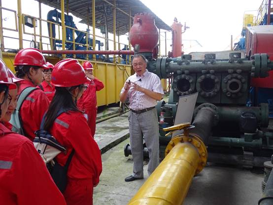 安先彬首先強調了注意事項,包括未經允許不得觸動任何閘閥、進入鉆井平臺必須戴安全帽等,為實習隊員安全有序實習做足準備、打好基礎。