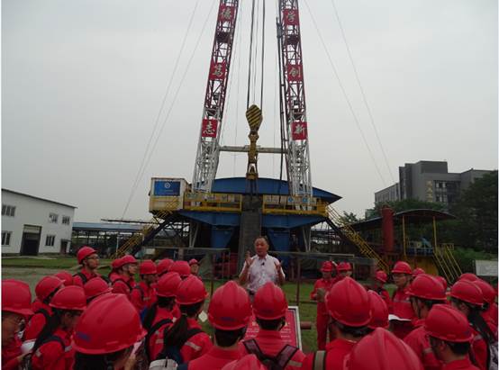在校內,安先彬高工先后帶領同學們參觀了鉆井井場、采油氣井場和地面油氣集輸系統。參觀鉆井井場過程中,實習隊員接觸到鉆機及其八大系統、鉆柱及其結構組成、吊環等井口工具、指重表等鉆井儀表、起下鉆等鉆進過程,并重點學習了鉆井泵等循環系統設備、防噴器等井控設備、節流壓井管匯等地面管匯。在參觀采油井場時,大家繼續深入了解了采油樹、抽油機、抽油桿、抽油泵基本結構、工作原理等內容。參觀采氣井場過程中,隊員全面認識了采氣樹、水套加熱爐、氣液分離器、匯管等設備組成、結構、原理。