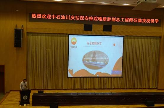 彭星煜首先代表實習隊對遠道專程來校講學的喻建勝副總工程師及其研究團隊一行6人表示熱烈的歡迎,要求全體同學認真聽講,積極踴躍向校外專家教授提問學習,并把講座內容與實習經歷結合起來,以期取得良好的效果。隨后,他就川慶鉆探及喻總團隊基本情況作了簡單介紹。