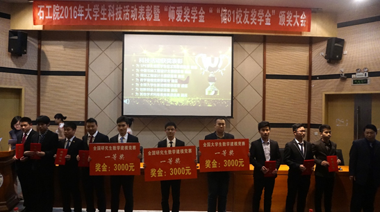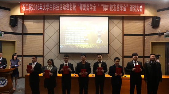 為表彰2015—2016學年度大學生科技競賽優秀集體和個人,激勵廣大學子積極投身科技活動,營造良好的學術氛圍。12月28日19時30分,石工院大學生科技活動表彰暨“師愛獎學金”、“儲81校友獎學金”頒獎大會在思學樓A114舉行。師愛獎學金設立者原西南石油學院副院長李士倫、學院黨委副書記姚利、副院長康毅力、梁光川,團委書記陳剛、學工辦副主任張繼出席頒獎大會,250余名學生參與本次頒獎活動。