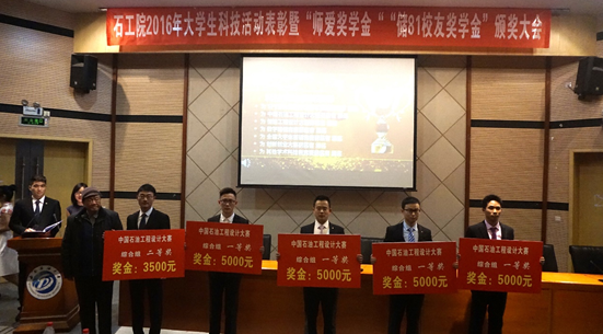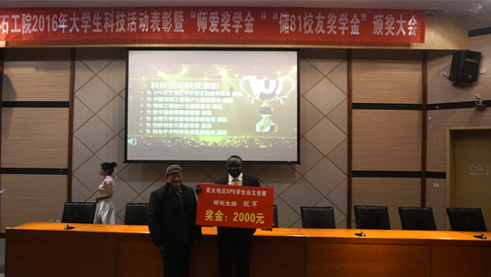 回望2015-2016學年,學院科技競賽碩果累累。博士生Aliu榮獲SPE亞太地區學生論文競賽研究生組冠軍;石油工程設計大賽中,石工院斬獲一等獎8項,數量位列國內石油類高校首位;油氣儲運工程設計大賽、數學建模競賽、全國大學生英語競賽及其他各種國家級競賽中均取得優異成績,為學校贏得了榮譽。在各類大學生科技活動的表彰活動中,李士倫、姚利、梁光川、康毅力等先后為“SPE亞太地區學生論文競賽冠軍”、“全國大學生英語競賽”、“全國大學生數學建模競賽”及“師愛新生勵志獎學金”等獲獎代表頒獎。