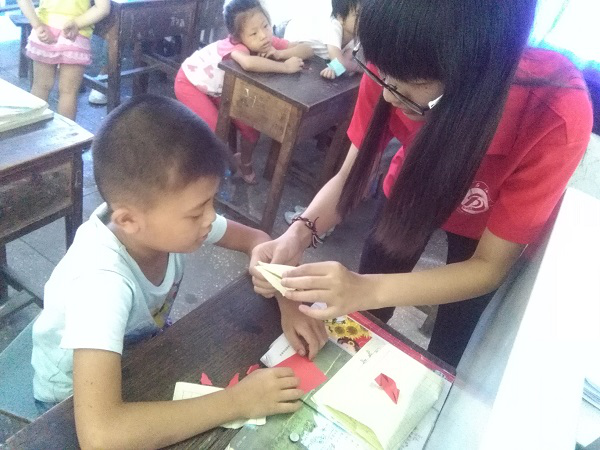 下午兩點半,烈日灼燒著街道。如往常一樣,西南石油大學(xué)“逐夢先鋒”暑期實踐隊隊員們頂著烈日,向?qū)W校走去。90分鐘的作業(yè)輔導(dǎo)后,同學(xué)們進入了以“小折紙,大夢想”為主題的折紙課堂。