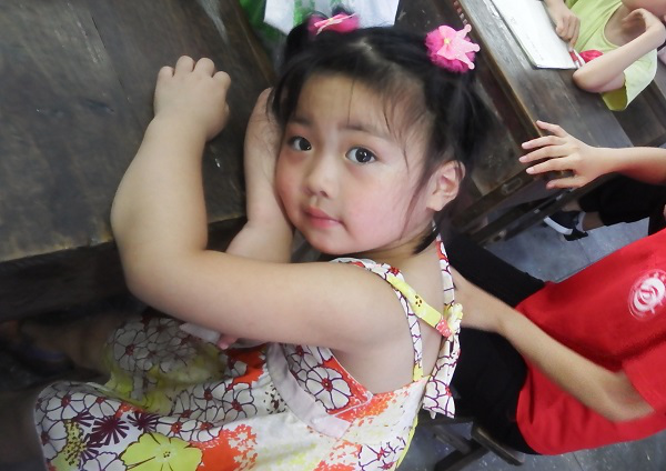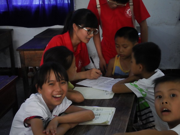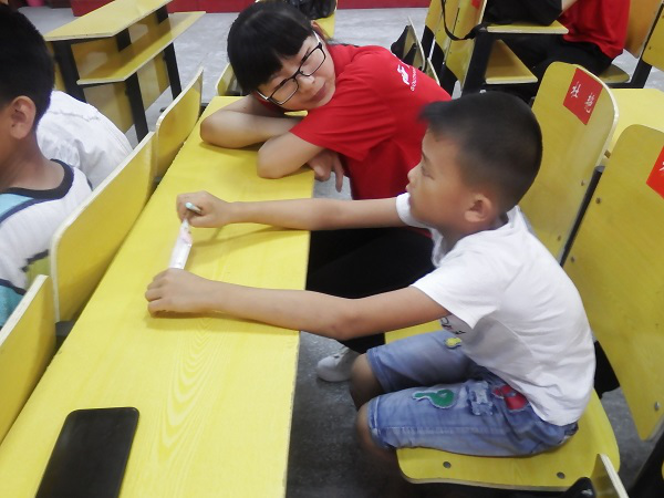 下午三點,實踐隊隊員與小朋友準時出現在教室門口。與上午有所不同的是,小朋友的人數翻了一倍。下午是輔導作業的時間。看著小朋友們奮筆疾書的小手和渴望知識的眼神,老師們都變得格外有耐心,為小朋友們一一解惑。窗外烈日灼灼,在沒有風扇的室內,小朋友們額頭上不停滾落的汗珠,隊員們便自制扇子為小朋友們扇風,自身衣衫早被濕透卻渾然不知。