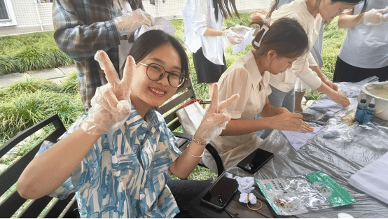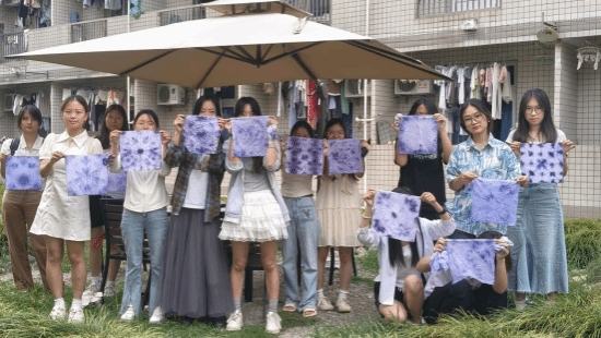 “期末周背公式、刷題腦子都是數字,今天捏著布角、系著皮筋,反而找到了'慢下來'的感覺。看著靛藍漸漸暈染開來,心情也變得平靜。”來自電信院的羅欣茹同學表示。活動現場氣氛輕松愉快,同學們暫時放下了學業負擔,沉浸在手工創作的樂趣中,感受到了非遺技藝的治愈力。扎染不僅是技藝傳承,更是一種藝術療愈。色彩的流動與變化有效緩解了同學們的焦慮情緒,幫助大家在緊張的期末周調整心態。許多參與者表示,通過此次活動,不僅領略到了傳統文化的魅力,還在創作中找到了身心放松的方式。