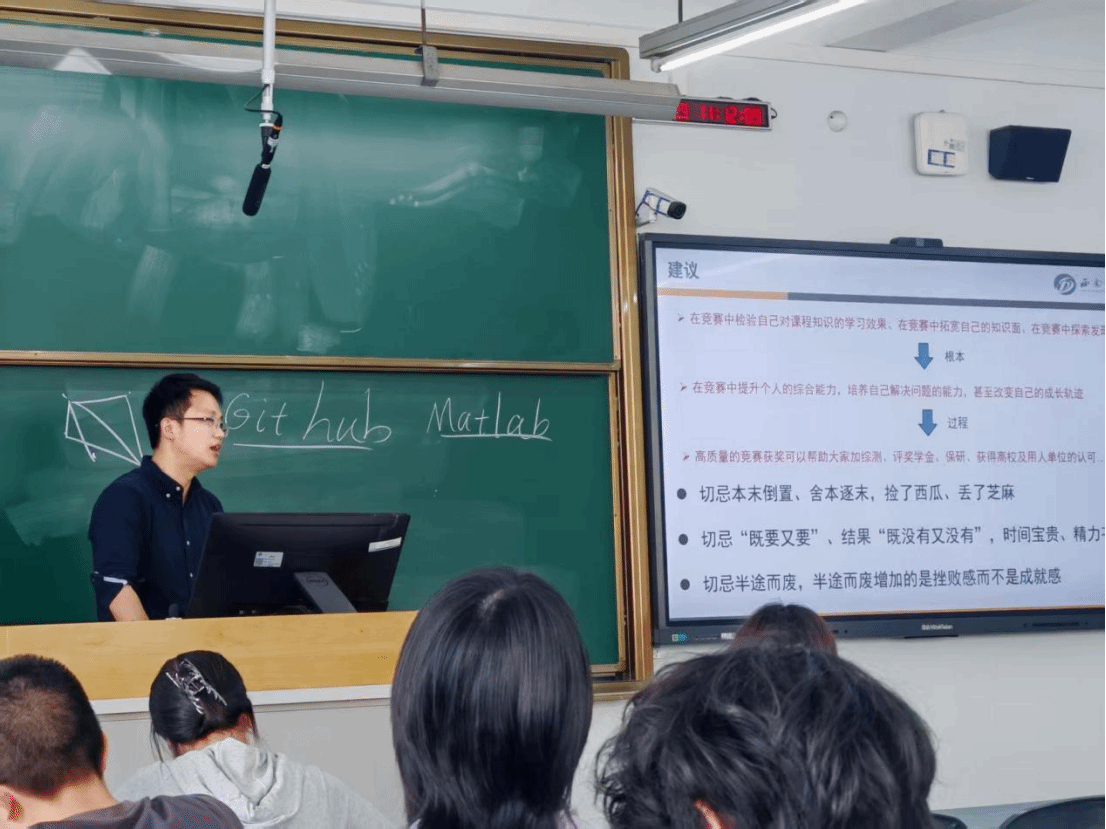 本次講座的主講人周航宇是一位競賽經驗豐富的老師。他首先為同學們介紹了四大國家級競賽,讓大家對這些高含金量的賽事有了初步認識。在數學建模大賽的介紹中,周航宇老師從選拔機制、培訓流程兩個關鍵方面展開。選拔機制決定了同學們能否踏上這場思維挑戰之旅,而培訓流程則是提升能力、打磨作品的重要環節。