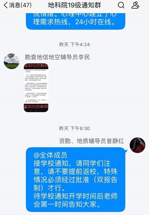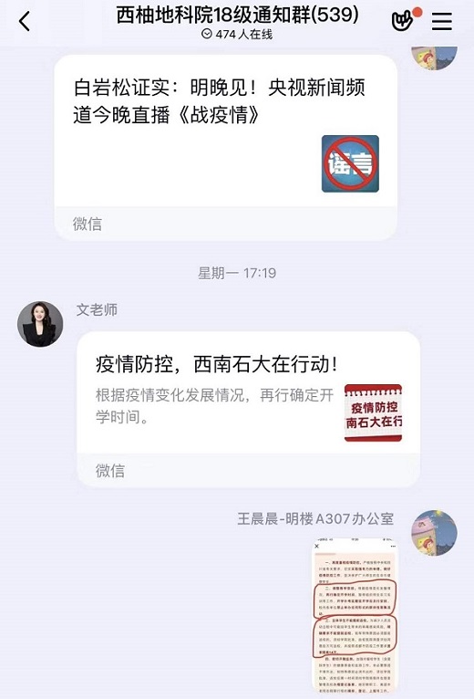 輔導員老師們積極轉發學校有關疫情防控的通知到QQ群中,傳達學校的防控工作精神,使每一位同學了解疫情有關情況;老師主動了解湖北武漢籍學生的身體健康情況,并兩次打電話詢問有關情況,叮囑學生做好有關工作;輔導員與班長進行溝通,將學校的精神傳達給每一位班級成員,提醒同學們切勿提前返校,做好防疫措施。
