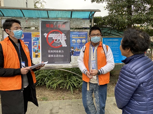 地科院碩士志愿者統(tǒng)一穿上馬甲,走在校內(nèi)外調(diào)研地點,向過往的同學和社區(qū)人員宣傳普及文明上網(wǎng),引導爭做合格網(wǎng)民。自地科院碩士進德修業(yè)小組的調(diào)研行動開始以來,小組成員在線上積極宣傳“反對網(wǎng)絡暴力,謹慎言語自由”相關法律知識,廣泛動員同學們參與問卷調(diào)查,前期已經(jīng)取得良好的宣傳效果。此次線下宣傳活動,內(nèi)容主要為在校內(nèi)外發(fā)放“反對網(wǎng)絡暴力,謹慎言語自由”宣傳單、張貼宣傳海報,邀請校內(nèi)外人員參與問卷調(diào)查,了解反對網(wǎng)絡暴力的相關看法。許多人在填寫問卷時,對于一些網(wǎng)絡暴力事件發(fā)表了自己的看法:網(wǎng)民在參與網(wǎng)絡暴力的過程中,接觸到的是謾罵、攻擊等暴力符號,這勢必會影響到網(wǎng)民的心理狀態(tài),從而導致網(wǎng)民把網(wǎng)絡中接觸到的暴力信息轉(zhuǎn)移到現(xiàn)實社會中。校內(nèi)外高年齡層的人,由于不常使用互聯(lián)網(wǎng),對網(wǎng)絡暴力事件并不是很了解,在項目組成員耐心講解之后,表示認識到了網(wǎng)絡暴力事件的惡劣性質(zhì)和其對當事人以及社會造成的嚴重影響。