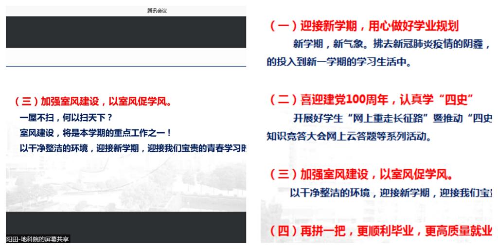 各位老師在年級大會上也強調了要積極做到開學收心,以全新狀態迎接新學期,要喜迎建黨一百周年、自覺認真學四史,要搞好寢室衛生、做好安全用電等工作。