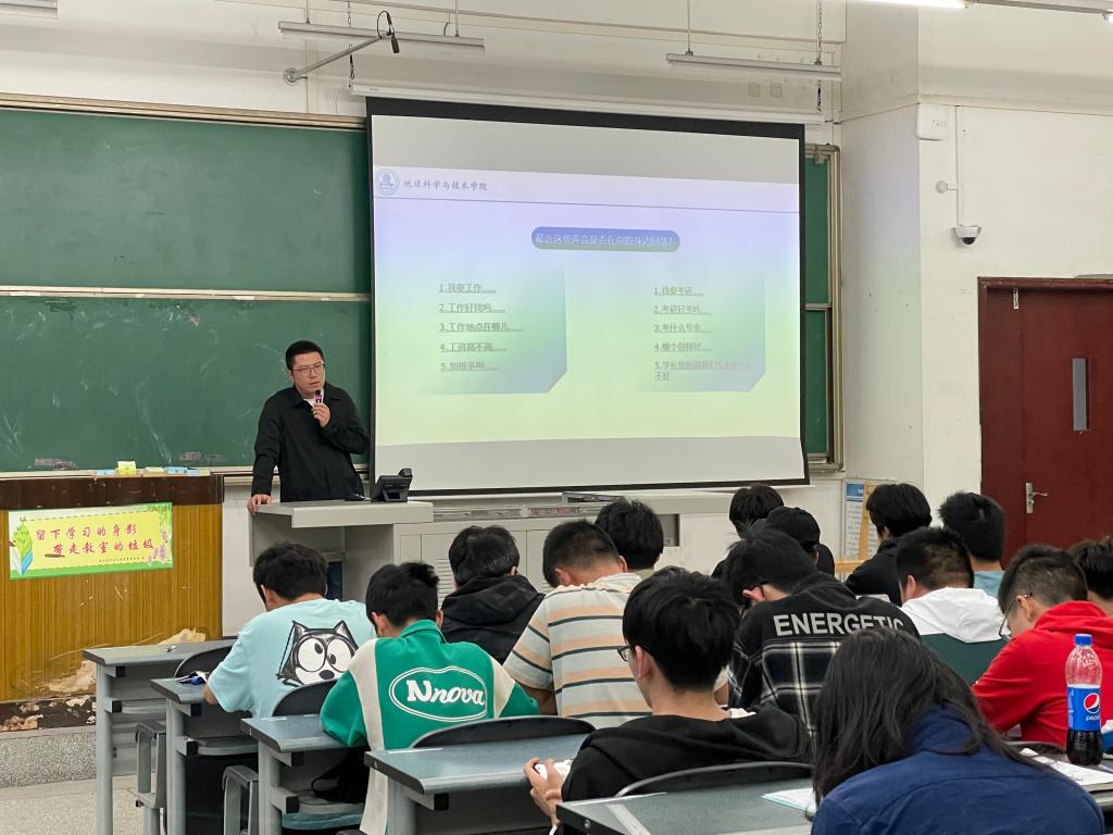 2020級本科生輔導員黃爽,強調了學風的重要性,并且就學風建設建設提出了三點要求:第一、嚴格落實《地球科學與技術學院學生課堂考勤管理辦法》,提高同學們的出勤率及學習的積極性;第二、鼓勵同學們完成第一課堂的同時,積極參加第二課堂的活動;第三、希望同學們做好考研、就業的選擇,合理規劃學業和職業,為明年的畢業提前做好思想和行動的準備。