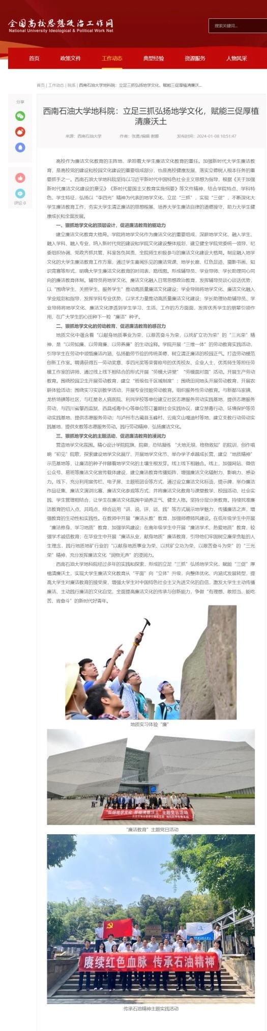 為加強新時代大學生廉潔教育,夯實大學生清正廉潔的思想根基,扎實推進高校廉潔教育工作。近日,我院黨委副書記、紀委書記張勇結合學院文化、學科特色、學生特點與工作實際,在全國高校思想政治工作網發表了題為《立足三抓弘揚地學文化,賦能三促厚植清廉沃土》的工作案例。