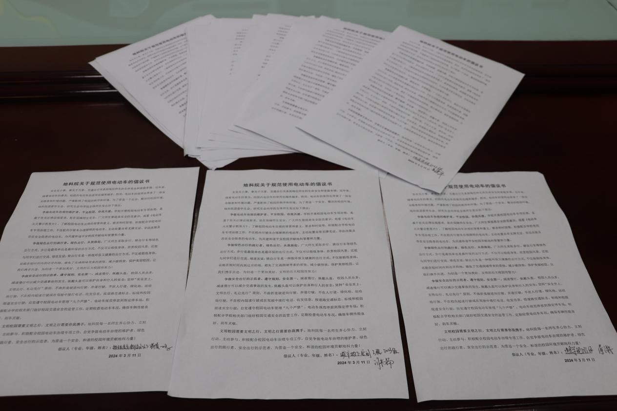 “安全無小事,事關千萬家。交通出行關系到每位師生的生命安全和家庭幸福?!陛o導員程鑫宣讀了《地科院關于規范使用電動車的倡議書》。在座同學紛紛在倡議書上簽名。