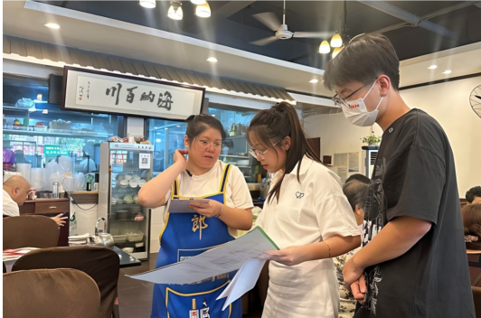 “我已經(jīng)很努力在復(fù)習(xí)英語了,但是四級考了兩次還是沒通過,我真的很著急!”2023級兼職輔導(dǎo)員李佳芮得知學(xué)生小嚴(yán)英語學(xué)習(xí)的困擾后前往學(xué)生小嚴(yán)家的餐館。李佳芮向家長介紹了大學(xué)英語四六級的重要性,向小嚴(yán)分享了英語聽力、閱讀理解的技巧,同時還鼓勵小嚴(yán)保持積極的心態(tài),相信自己有能力克服難關(guān)。
