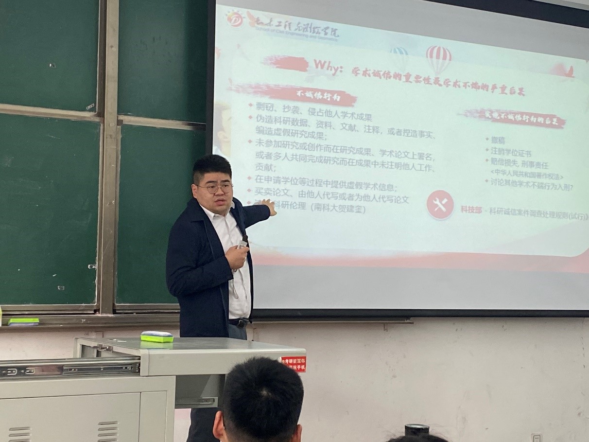 系列活動之新生入學學術誠信教育會特邀請土木工程與測繪學院副院長梁琦老師擔任主講,梁琦老師引用大量學術不端案例,從多個角度幫助學生理解“學術不端”概念,杜絕“學術不當”行為。在活動的最后,梁琦老師寫下了“質量是永恒”和“憑良心做科研”兩句話,告誡同學們在今后的工作和學習中要腳踏實地,不忘初心。