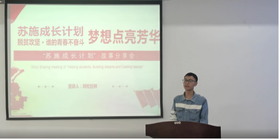 阿杜拉林講述了自己的家庭環境,他來自涼山州的雷波縣,環境艱苦,但憑借不懈的努力,他最終從鄉村走到了城市,自中學邁向了大學。“環境的改變總是讓人忍不住擔心又憧憬,我擔憂老師是否友善,生活是否習慣,學習能否跟上進度。”阿杜拉林非常感激照顧他的師生,特別是老師們不僅給予了關心和問候,更提供了“蘇施”成長計劃的平臺。感恩的最好方式便是奮斗,所以這一年來阿杜拉林未曾有過絲毫懈怠,他認真學習,廣泛閱讀課內外書籍,積極參加課外活動和學生工作,不斷為班級貢獻,做志愿者為同學服務。