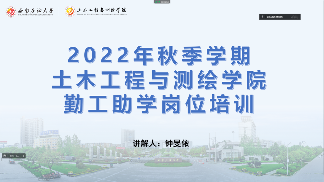 根據《西南石油大學學生勤工助學管理辦法》(西南石大學〔2019〕47號)的文件精神,為規范、落實我院學生勤工助學工作,發揮勤工助學平臺育人功能,協助各單位做好科研、管理等工作。11月1日土測院鐘旻依老師通過騰訊會議開展了我院勤工助學崗位培訓。