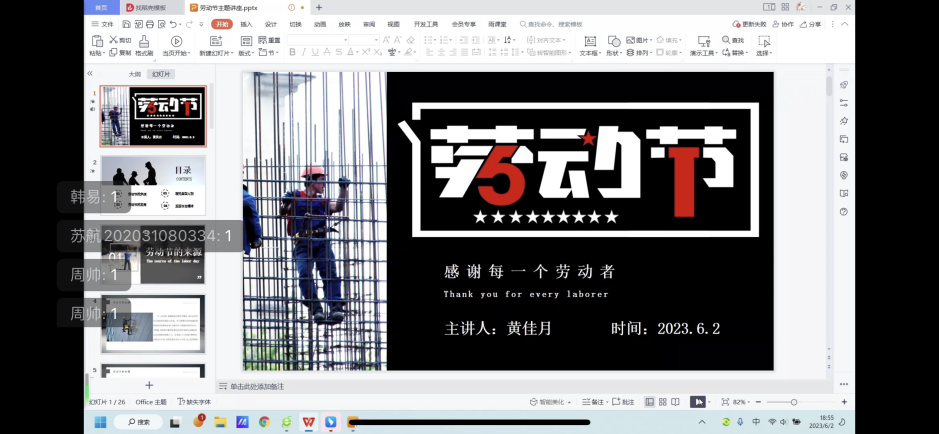 講座的主要內(nèi)容包括:勞動(dòng)節(jié)的來(lái)源,勞動(dòng)節(jié)的發(fā)展,相關(guān)典型人物,發(fā)揚(yáng)節(jié)日精神。主持人對(duì)勞動(dòng)節(jié)來(lái)源和發(fā)展進(jìn)行了介紹,讓同學(xué)們初步感知了勞動(dòng)節(jié)精神;再通過(guò)王進(jìn)喜、吳人寶、袁隆平等勞動(dòng)模范事跡使同學(xué)們深刻理解勞動(dòng)精神的內(nèi)涵;最后向同學(xué)們傳遞“弘揚(yáng)勞模精神,爭(zhēng)做時(shí)代楷模”、“弘揚(yáng)工匠精神,助推民族復(fù)興”、“三百六十行,行行出狀元”的節(jié)日精神。