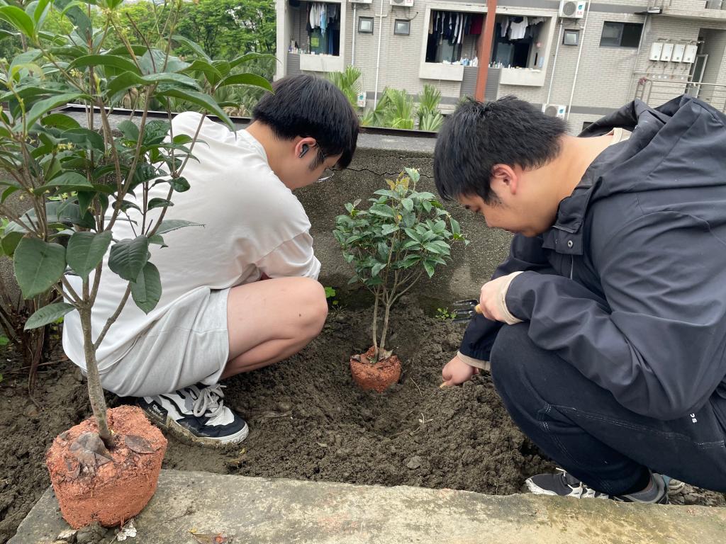 接下來,各小組同學分工明確,就分得的種植區域和植物開展工作。他們拿起鋤頭、鐵耙共同協作,大家擼起袖子,清理石頭雜草后,找準定位,刨土挖坑,將一顆顆植物種進土里。各個環節氣氛熱烈,銜接有序。各小組同學看到親手種下的綠植,喜悅與自豪之情躍然臉上。