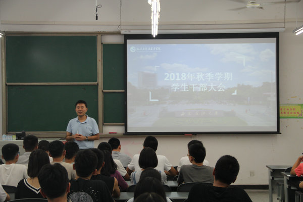 隨后,新任學生會主席張宇瀟對2018年秋季新學期的學生工作做出了指示。他指出,在新學期的學生工作中,首先要把即將到來的迎新工作放在重心,更重要的是本學期的文娛工作,即本學期中后期的體育節(jié)和迎新晚會。其中,他特別指出,學生會代表了土建院,一定要注意自己的言行舉止,要積極地服務他人,禁止向新生推銷任何產(chǎn)品。安排完日常工作后,各部門的部長都上臺做了簡單的自我介紹,對自己的工作和日后的規(guī)劃提出了自己的看法。