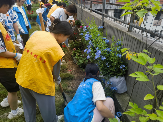 各小組分工明確,在各自的種植區域開展花卉種植活動。同學們戴上手套共同協作,使用鐮刀、耙子等工具清理“空中花園”里的雜草并清運,清掃“空中花園”的環境衛生。緊接著,他們在園藝師的指導下拿起鐵鍬,找準定位刨土挖坑,將一株株美麗的花卉種進土里。在種植過程中,同學們小心翼翼地將花卉從花盆內移植進挖好的土坑中,而后扶正花苗,用鏟子輕輕培土,再用手輕輕壓實,生怕傷害到這些嬌嫩的生命。各個活動環節氣氛熱烈,銜接有序。同學們看著“空中花園”因他們親手種下的綠植逐漸變得五彩斑斕、生機勃勃,喜悅與自豪感由然心生。