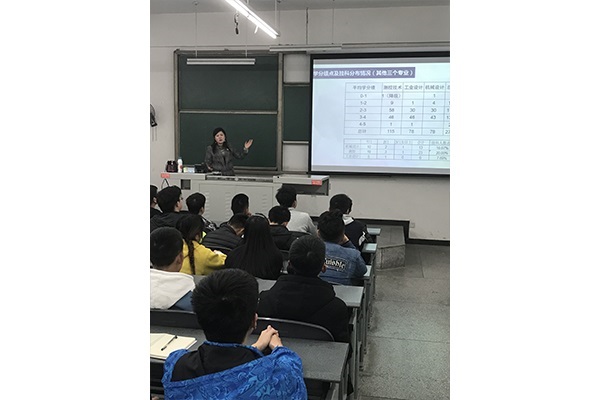 大會(huì)上喻老師主要針對(duì)本專(zhuān)業(yè)17級(jí)的新生上學(xué)期的學(xué)習(xí)情況各個(gè)班級(jí)的具體情況進(jìn)行了分析總結(jié)。首先在大會(huì)開(kāi)始時(shí)通告了這學(xué)期的專(zhuān)業(yè)轉(zhuǎn)入轉(zhuǎn)出人員情況,隨后開(kāi)始重點(diǎn)分析機(jī)械工程專(zhuān)業(yè)經(jīng)過(guò)大一上學(xué)前期一個(gè)學(xué)期之后在學(xué)業(yè)方面暴露出來(lái)的問(wèn)題,包括掛科率,掛科人數(shù),四級(jí)通過(guò)率和班委團(tuán)隊(duì)以及班級(jí)平均績(jī)點(diǎn)等具體數(shù)據(jù)的分析警示著我們上一學(xué)期的不足。