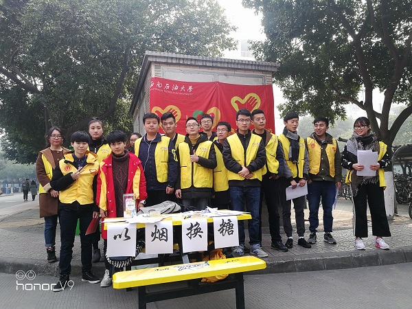 冬至,12月22日午時,于一期食堂外,機電院青志協與材料院青志協聯合舉辦了“校園無煙,以煙換糖”的志愿活動。