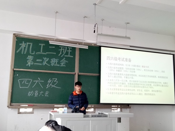 學(xué)期過了一大半,同學(xué)們迎來了四六級考試和期末復(fù)習(xí)月,緊張的學(xué)習(xí)氛圍也逐漸散布至大家的生活中。為了提高班級四六級過級率,讓大家都取得良好的期末成績,2016級機械工程二班于11月30日下午兩點半明志樓A307開展本學(xué)期第二次班級大會——四六級及期末學(xué)習(xí)交流會。