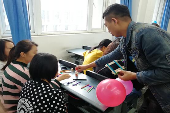 大會分為協會介紹、動手操作、成品展示和有獎競答等環節。最值得一提的環節是動手操作環節,協會會員自己動手制作手工作品,大家現場手工制作將全場氣氛推向了高潮。協會理事也來到教室各處,并教萌新們利用雪糕棒制作各式筆筒、相框。自學成才的同學也有許多,大家充分發揮想象,向同伴提供自己的想法,用雙手創造屬于自己的美好;此外,不善于制作手工作品的同學利用氣球制作裝飾品,五顏六色的氣球也成了活動教室一道道亮麗的風景線。