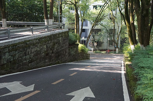 老校區依山而建,不同于成都校區的平坦規整。從西邊正大門進去,向里一路上坡,道路都是些林蔭大道和小道,建筑緊緊相依,教學樓緊挨著實驗樓,擋土墻上爬滿了藤蔓,臺階、路堤、路塹也常見。我們在這樣平靜祥和的校園里走一走,想象不出當年的奮斗歷程是多么艱辛,但還是能聞到濃厚的歷史的滄桑。