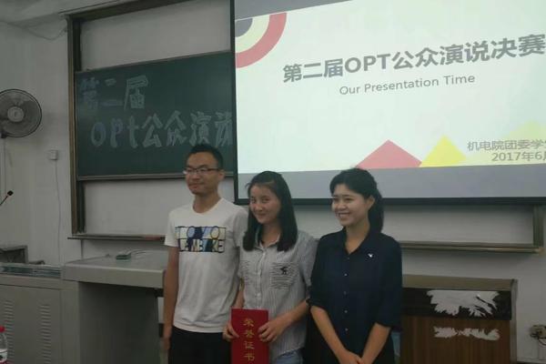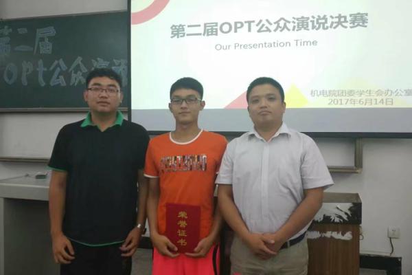 涼風習習,微風陣陣,在榴花似火的六月里,我們終于迎來了OPT公眾演說大賽總決賽。OPT旨在為學生建立一個思考、創新和共享的平臺,給大家提供機會,展現自我;發表個人看法,展現個人魅力。機電院團委學生會辦公室于6月14日晚7點半思學樓c506舉辦了OPT決賽。
