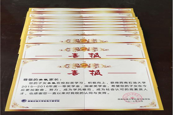 為了表彰、勉勵優秀學生,加強與學生家庭的聯系,增進家長對孩子在學校情況的了解,共同努力將學生培養成為德、智、體全面發展的優秀人才。西南石油大學機電工程學院將部分優秀學生在校獲獎情況,通過“喜報”的方式寄送至學生父母手中。