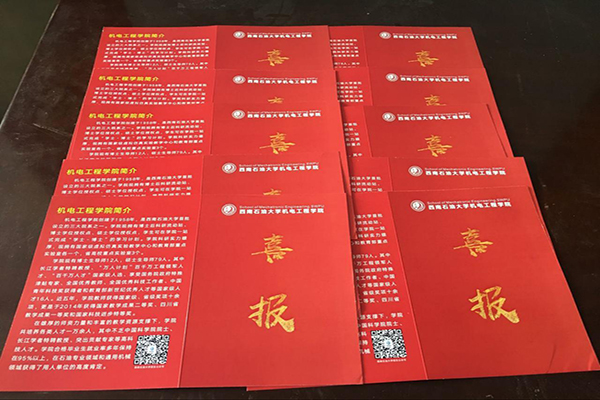 本次的寄發范圍為學院在校學生獲得2015-2016年度獲得國家獎學金和國家勵志獎學金、省獎國獎獲得者等優秀學生共計237名在校學生,237份喜報全都在7月7日順利寄出。喜報內容包含了獎學金獲獎情況,也涵蓋了西南石油大學機電工程學院的學院介紹,封面還有西南石油大學招生公眾號二維碼。