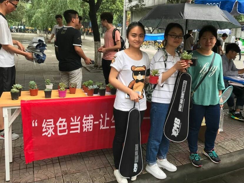 2017年5月22日,西南石油大學機電工程學院同學在一食堂門口開展進德修業“綠色當鋪--讓生活多一點綠色”主題活動。此次活動通過廢舊物品換取綠色植物的方式,旨在宣傳綠色環保的生活理念,鼓勵大學生為環保事業貢獻出自己的一份力量。