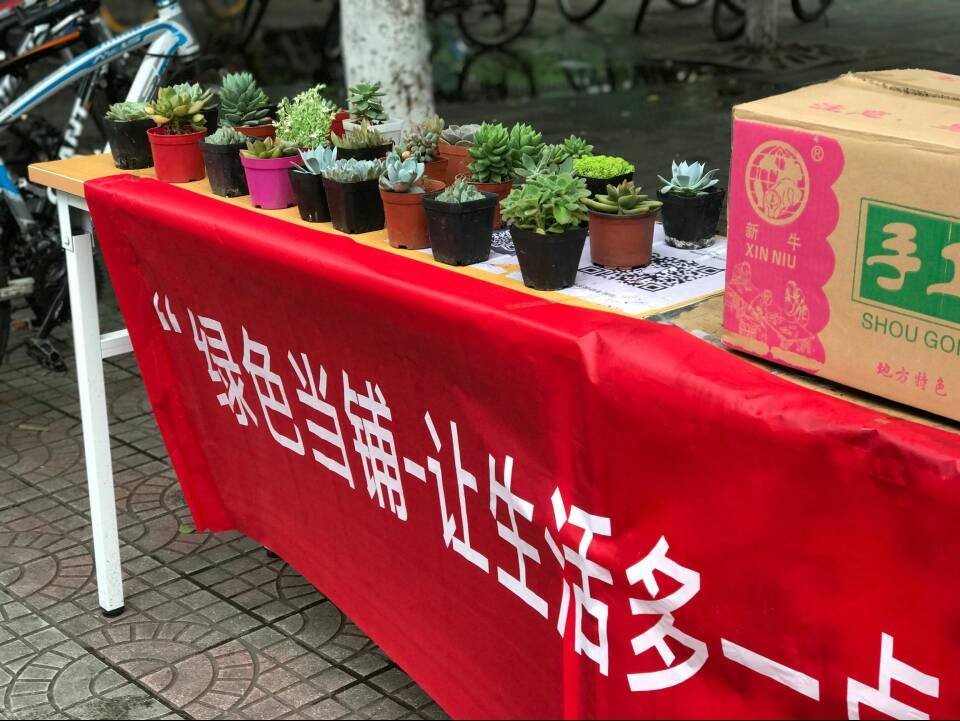 上午十一點半,小組成員提前來到一食堂門口開始準備工作。隨著下課鈴聲響起,一食堂外人流量陸續增多,過往的同學們都被桌上一排排的小綠植所吸引,主動到宿舍取出閑置的書籍,廢舊的電池等物品交給小組成員們。由于現場氣氛熱烈,同學們積極參與,小綠植不到二十分鐘被換走一大半,整個活動在歡聲笑語中結束。
