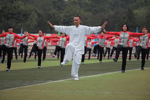 開幕式中,選手代表和裁判員宣誓結(jié)束后,學(xué)校學(xué)生和教工代表組成的代表隊(duì)分別進(jìn)行了陽(yáng)光排舞和八段錦表演。