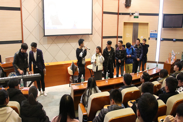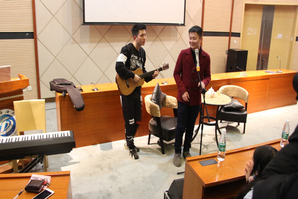 活動開始,由陳煒康學長進行現場氣氛活躍。隨后,對成都夢語文化傳播有限公司音樂總監譚曦老師進行現場訪談。在訪談中,譚曦老師與同學們暢談了他的音樂經歷,譚曦老師毫不吝嗇的向同學們說道:“我喜歡音樂是從喜歡一個女生開始的。”接著,他又向同學們詳細介紹了吐字歸音等一些唱歌的基本技巧。互動環節,現場的同學們積極進行歌唱演示,譚曦老師認真進行指導,他針對各位同學唱歌中存在的問題提出:“尾音要留住,氣息要hold住……”