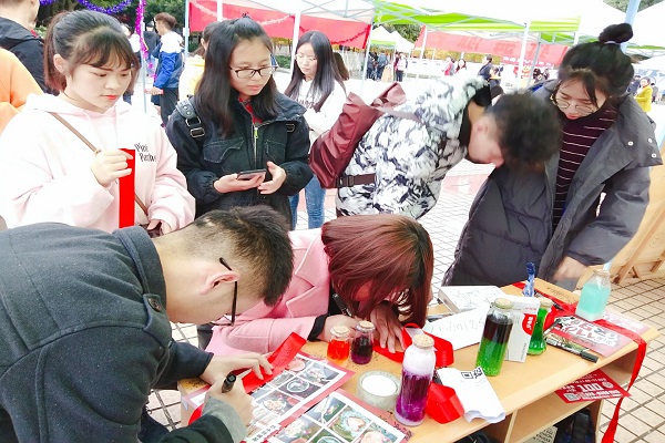 活動中途,化學協會的同學們帶來了進行義賣的漂亮的天氣瓶,精致的瓶子里是漂亮的結晶與藥水,各種天氣瓶讓同學們應接不暇。下午兩點半之后,我們協會去到了博學廣場參加社團風采展活動,這時,同學們的參與度更高了,一條條寫滿字的紅絲帶相繼被同學們掛上。風吹動絲帶起舞,同學們的心也在這金燦燦中蕩漾。有的同學希望通過紅絲帶尋覓屬于自己的愛情,有的同學希望在紅絲帶的祝福下考研成功,有的同學希望家人朋友一切安好。銀杏林里翻飛的紅絲帶,伴著桂香,隨著風兒飄向遠方。