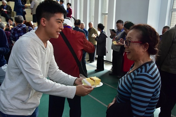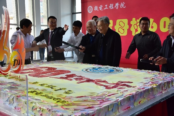 為紀念母校60華誕,機電工程學院特意準備了一個別具學院特色的生日蛋糕。58級薛菊芬大師姐,老領導馬德坤老師,礦機77級王進全校友,礦機83級張斌校友,機械90級尹永清校友,過程裝備與控制工程2012級校友武新春,機電院第六十屆團委學生會主席梁仕遠同學,機電院黨委書記李忠偉,石明江副院長為大家切下第一刀,將活動氛圍推向最高潮。大家一起品嘗美食,嘴中是香綿細軟的蛋糕,心中是化不開的喜悅,回味的是不曾褪去的濃濃機電情。