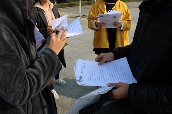 11月22日下午,項目小組嚴格進行了隊內的茶文化宣講培訓,項目組長也再三強調一定要把宣傳單分發到愿意去了解茶文化的人手中,發放的同時也要耐心地對宣傳單內容進行介紹。