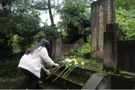 上午10時,“青馬工程”全體學員一同前往位于桂湖公園的王銘章烈士墓。在莊嚴肅穆的烈士紀念碑前,主持人向全體學員講述了王銘章烈士雄壯激昂的英雄事跡,描述了抗日戰爭期間的悲壯與慘烈,并帶領大家重溫入團誓詞,彰顯了新時代青年大學生的擔當與情懷。懷揣著對烈士的敬仰,全體學員依次為烈士獻上鮮花,用默哀表達自己的無限懷念,沉重悼念為國家和民族獻出生命的革命先輩。