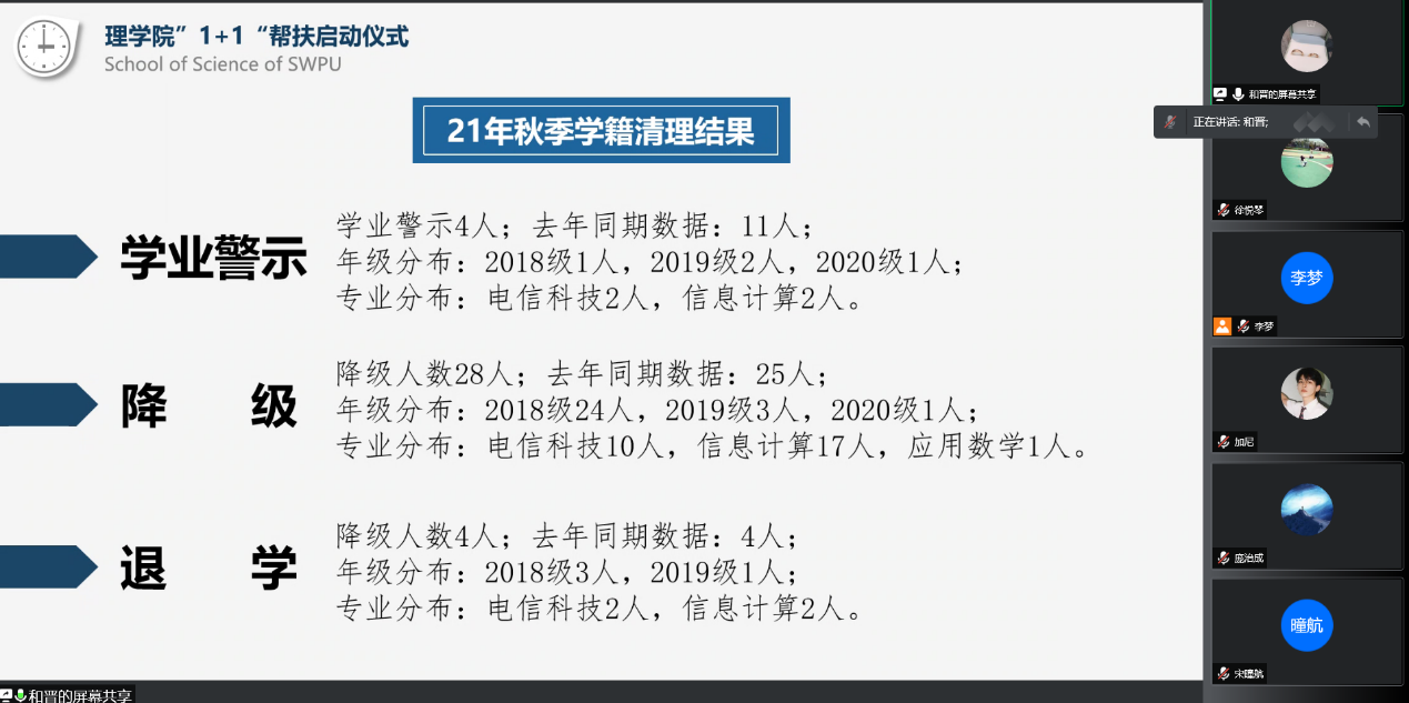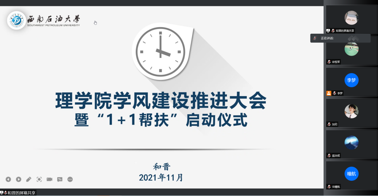 為進一步提升學院人才培養質量,深化、強化、細化學風建設,營造良好的學習氛圍,理學院于2021年11月10日晚7點在線上騰訊會議召開了理學院學風建設推進大會暨‘1+1幫扶’啟動儀式。信息與計算科學專業2020級班主任任俊杰、數學與應用數學專業2020級班主任劉瑞寬、輔導員和晉、李夢及全體結對幫扶同學參加會議,會議由和晉主持。