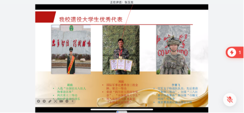 譚雙雙同學就入伍流程及注意事項進行講解,并分享了自己在部隊服役的日常生活和軍旅收獲,從青澀新兵成長為合格戰士的心路歷程,生動形象地講述了部隊日常訓練的點點滴滴,點燃了參會同學的參軍熱情。譚雙雙同學積極鼓勵有意愿參軍入伍的同學,堅定初心,把握機遇,將個人的青春理想自覺融入祖國偉大的強軍夢和復興夢的生動實踐中。