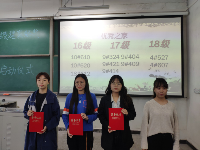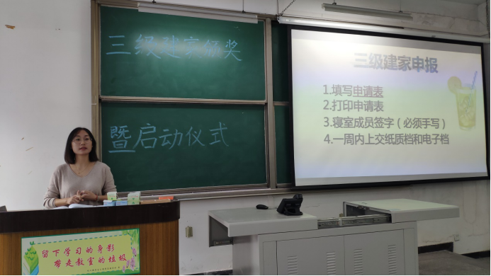 首先進行頒獎儀式,獲獎寢室長上臺領(lǐng)獎并合影留念。緊接著就是2019年度的三級建家啟動儀式,主持人白鑫為大家詳細(xì)地介紹了三級建家的申報步驟,包括需要填表、打印表格、寢室成員簽字等。隨后,生活部分管老師蔡小茵對2019年春季學(xué)期的三級建家進行了總結(jié)。她指出,整體上來看,這次三級建家效果顯著,女生建家的效果比男生更加明顯;但美中不足的是,本次三級建家活動沒有“模范之家”,還希望同學(xué)們再接再勵,也希望2019級的新同學(xué)們積極地參加建家活動,爭做“模范之家”。
