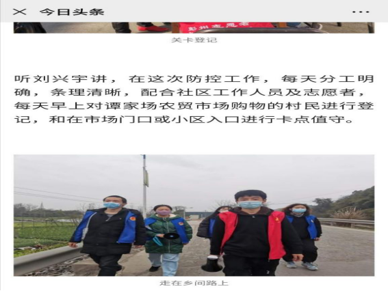 “我們這些在家的人步數(shù)全加起來(lái)都沒(méi)你多,給你點(diǎn)贊!”最近10天,化學(xué)工程與工藝2019級(jí)的向前錦牢牢占據(jù)微信朋友圈步行排行榜第一,原來(lái),他從每天早上8點(diǎn)開(kāi)始,就在全村范圍內(nèi)排查巡邏。向前錦家旁邊有一個(gè)大型菜市場(chǎng),人流量最高時(shí)達(dá)到1000,而志愿者卻不過(guò)十個(gè),“我也要像抗疫最美逆行者那樣,阻斷疫情,守好家鄉(xiāng)疫情防控第一線!”因?yàn)樯鐓^(qū)防控的突出表現(xiàn),向前錦所在志愿隊(duì)受到了“今日頭條”報(bào)道。