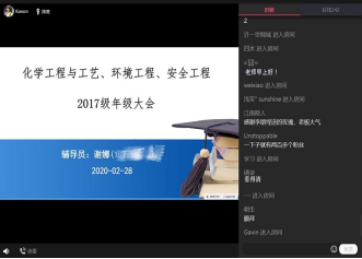 當前疫情防控處于攻堅階段,也是輔導員育人育心,開展思想政治教育的關鍵時期。教育不掉線,成長無間斷,為保證2020年春季學期開學工作順利進行,匯聚疫情防控青年力量,引導學生明確責任擔當,樹立必勝信心,開學之初,化工院面向全院近2000名學生開展線上年級大會。