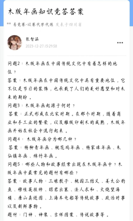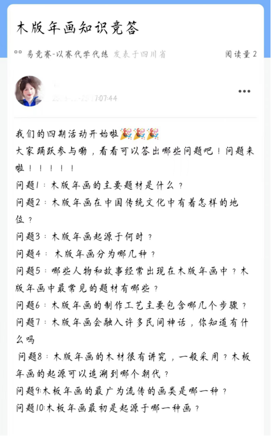 為賡續(xù)傳承中華文化,提高當(dāng)代青年人對于歷史中的遺珠——非物質(zhì)文化遺產(chǎn)的認(rèn)知與認(rèn)同。前三期活動:主題觀影、年畫展覽和年畫雕刻開展后,于2023年12月28日,化學(xué)化工學(xué)院應(yīng)用化學(xué)專業(yè)23級3班以木版年畫為主線,綜合前三期活動的知識科普,面向全院學(xué)生開展了進(jìn)德修業(yè)項(xiàng)目——“舊制雋記,以木刻新”木版年畫知識競賽活動。